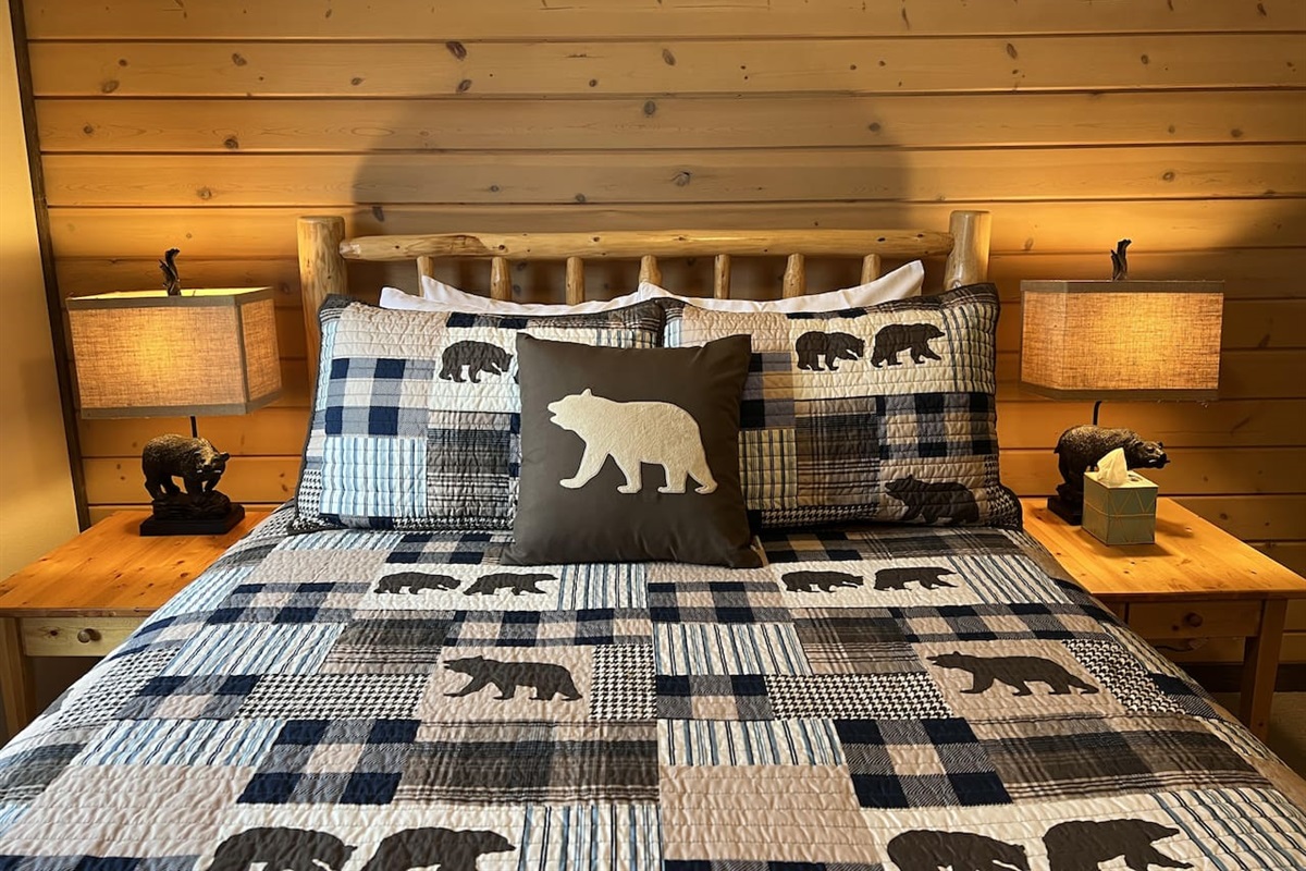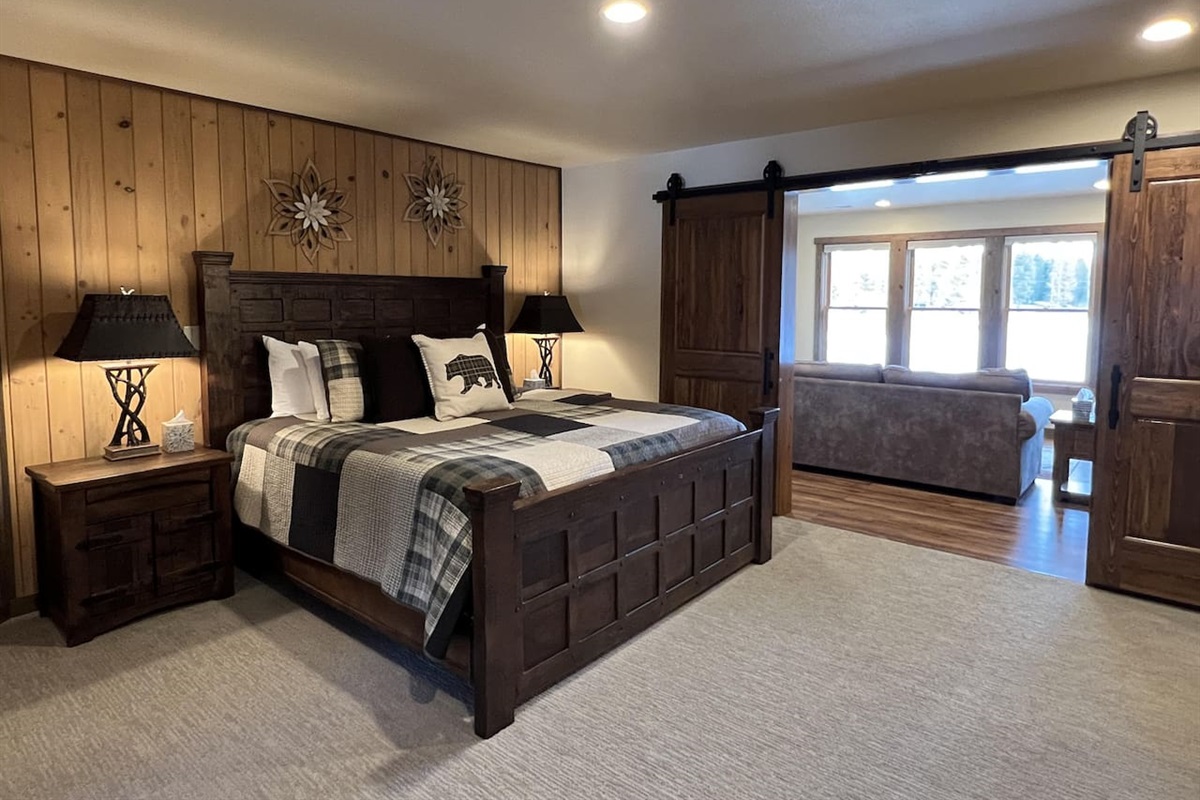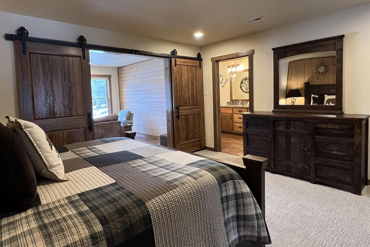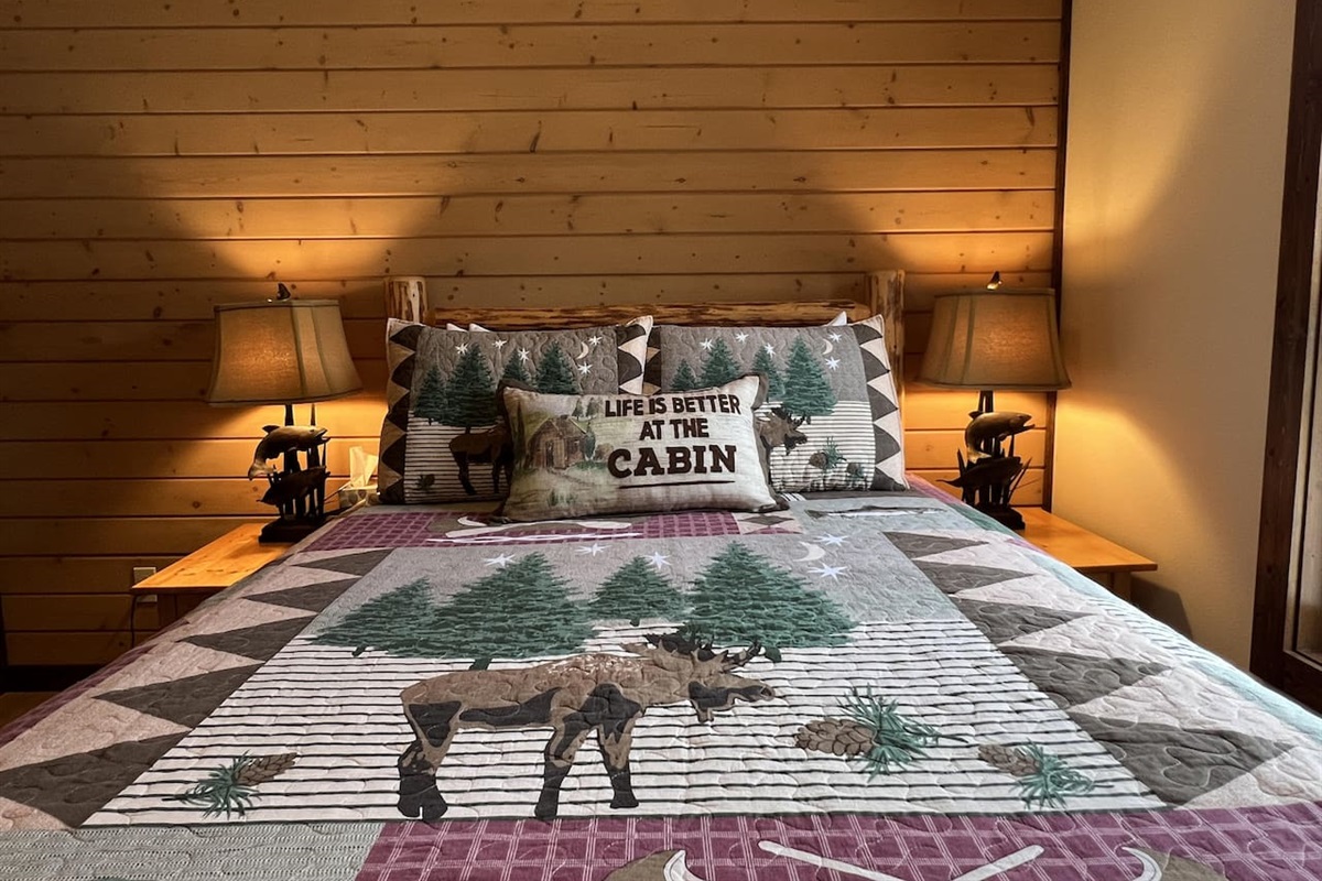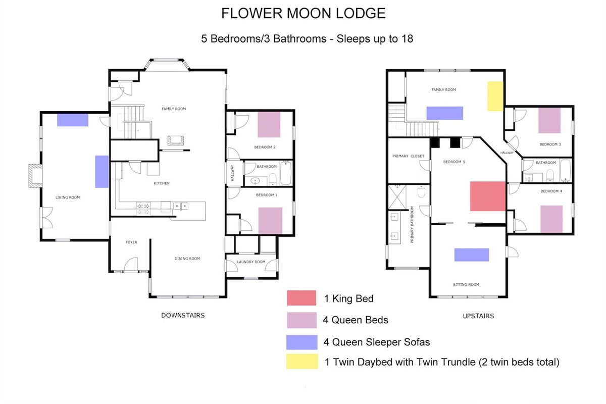 5 Bedrooms • 3 Bathrooms 3 Baths • Sleeps 11-18Our Flower Moon Lodge is a 5 bedroom, 3 bathroom house, equipped with brand new washer/dryer and appliances. This unit has been completely remodeled, so everything is brand new! Exquisitely designed, the house has 4 bedrooms with queen sized beds, and a master suite with a king sized bed. There are also 4 queen sized sleeper sofas and a day bed throughout the house allowing it to accommodate up to 18 people. With a huge kitchen, full sized refrigerator, oven/stove, dishwasher, and microwave, you are able to cook full meals if you would rather not go out. The unit overlooks a large pond and pasture area and has a large deck that wraps around half the house if you would like to sit outside and enjoy the atmosphere. The deck is also great for BBQing. The property itself is 15 acres with 2 ponds, lots of lawn space, trees, wooded areas, and pasture. There are multiple housing options on the property ranging from 5 bedroom cabins to a 1 bedroom handicap accessible apartment if you would like to rent several units together. Please don't hesitate to reach out with questions!