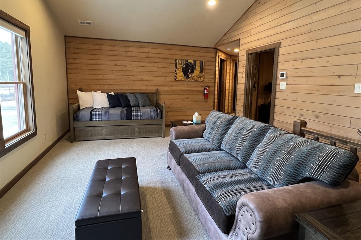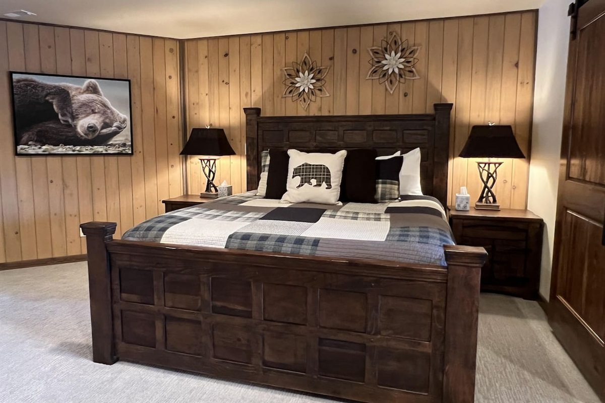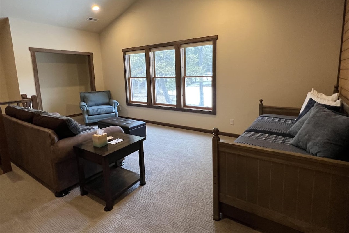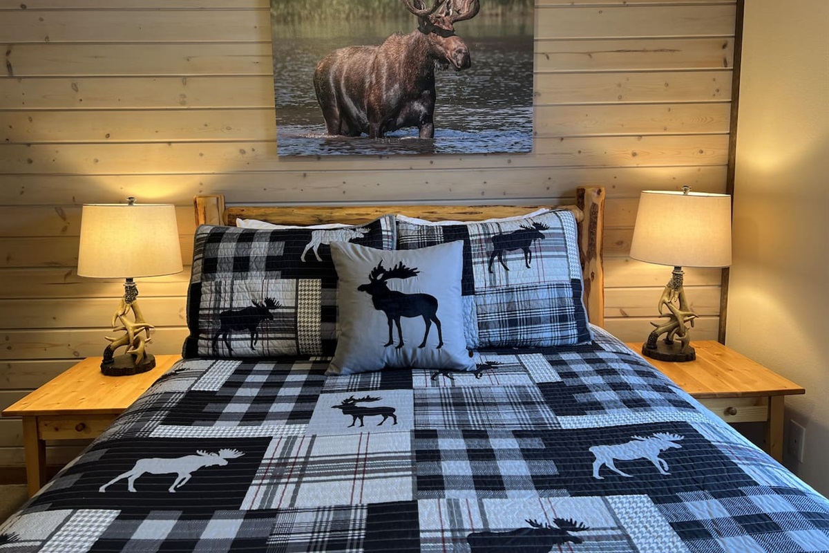 5 Bedrooms • 3 Bathrooms 3 Baths • Sleeps 11-18Our Flower Moon Lodge is a 5 bedroom, 3 bathroom house, equipped with brand new washer/dryer and appliances. This unit has been completely remodeled, so everything is brand new! Exquisitely designed, the house has 4 bedrooms with queen sized beds, and a master suite with a king sized bed. There are also 4 queen sized sleeper sofas and a day bed throughout the house allowing it to accommodate up to 18 people. With a huge kitchen, full sized refrigerator, oven/stove, dishwasher, and microwave, you are able to cook full meals if you would rather not go out. The unit overlooks a large pond and pasture area and has a large deck that wraps around half the house if you would like to sit outside and enjoy the atmosphere. The deck is also great for BBQing. The property itself is 15 acres with 2 ponds, lots of lawn space, trees, wooded areas, and pasture. There are multiple housing options on the property ranging from 5 bedroom cabins to a 1 bedroom handicap accessible apartment if you would like to rent several units together. Please don't hesitate to reach out with questions!